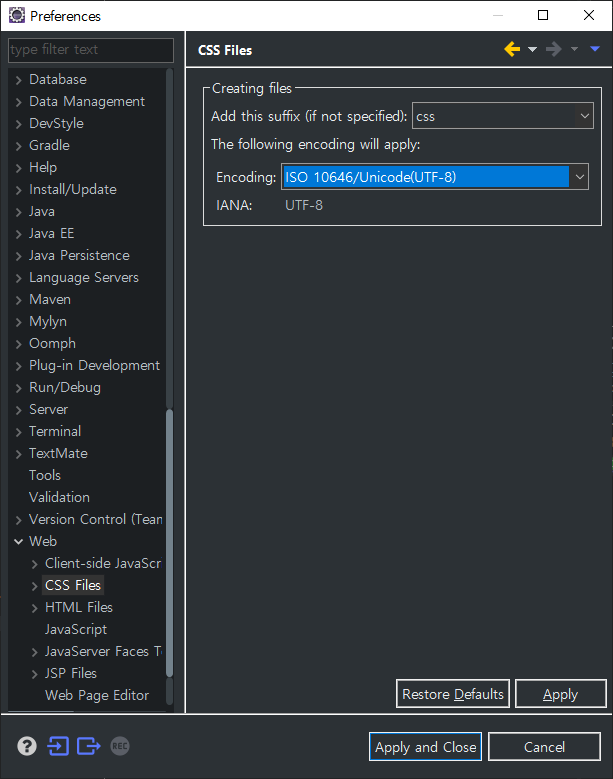 예시는 [Web] - [CSS Files] 이지만, [Web] - [HTML Files] 등 원하는 탭에서 각각 Encoding:"UTF-8"을 선택해주면 된다.