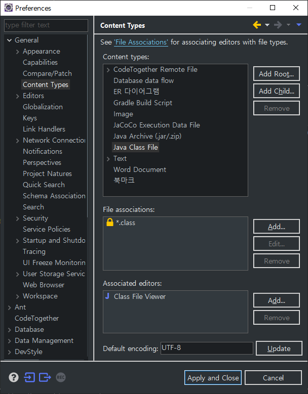 [Preferences] 창의 다음과 같은 항목들에서 모든 Encoding 방식을 "UTF-8" 로 바꾸어준다.