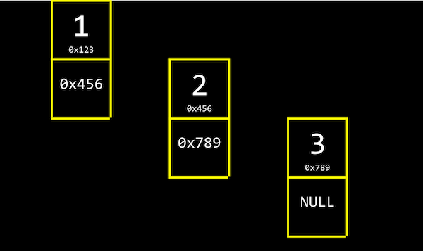 3은 다음 값이 없기 때문에 NULL (\0, 즉 0으로 채워진 값을 의미합니다)을 다음 값의 주소로 저장합니다.