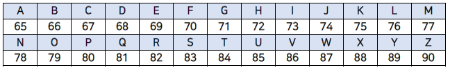 총 128개의 부호로 정의되어 있는데, 가령 알파벳 A는 10진수 기준으로 65, 알파벳 B는 66로 되어있습니다.