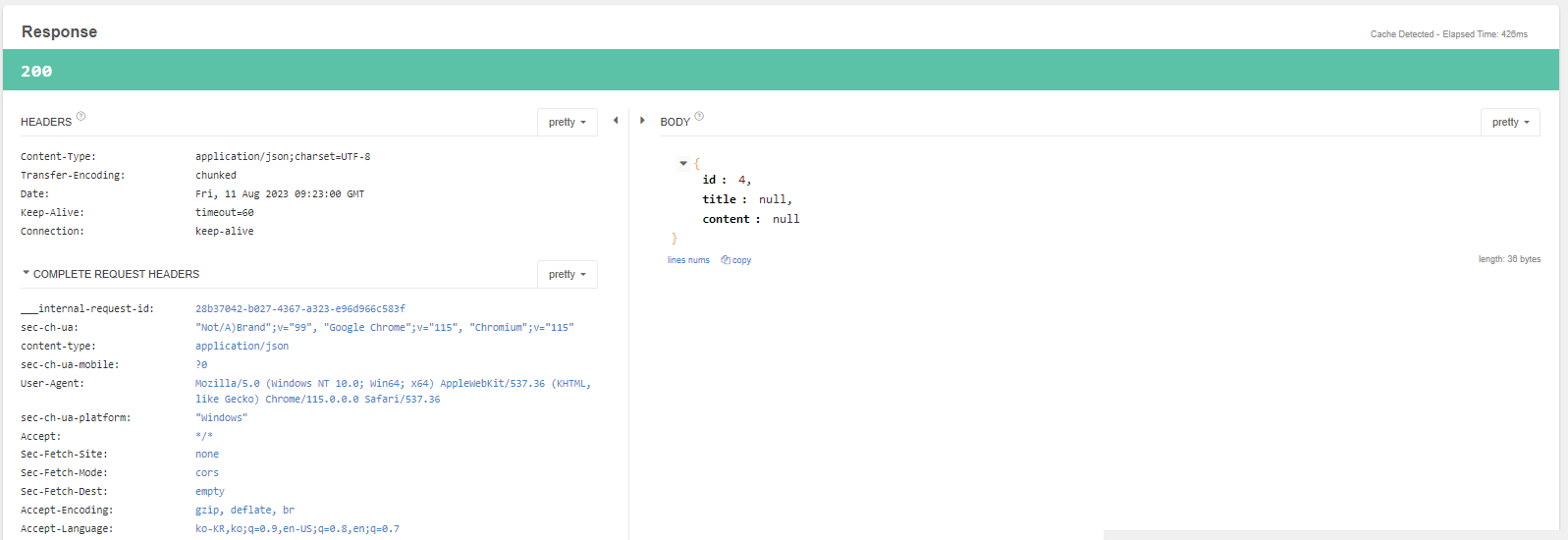 결과: 200 상태코드를 반환받긴 했지만, title과 content 에 null 값이 들어감