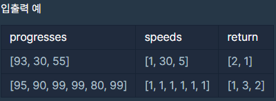 먼저 배포되어야 하는 순서대로 작업의 진도가 적힌 정수 배열 progresses와 각 작업의 개발 속도가 적힌 정수 배열 speeds가 주어질 때 각 배포마다 몇 개의 기능이 배포되는지를 return 하도록 solution 함수를 완성하세요.