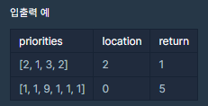 현재 실행 대기 큐(Queue)에 있는 프로세스의 중요도가 순서대로 담긴 배열 priorities와, 몇 번째로 실행되는지 알고싶은 프로세스의 위치를 알려주는 location이 매개변수로 주어질 때, 해당 프로세스가 몇 번째로 실행되는지 return 하도록 solution 함수를 작성해주세요.