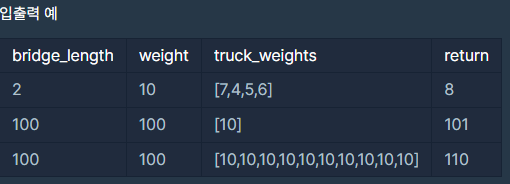 solution 함수의 매개변수로 다리에 올라갈 수 있는 트럭 수 bridge_length, 다리가 견딜 수 있는 무게 weight, 트럭 별 무게 truck_weights가 주어집니다. 이때 모든 트럭이 다리를 건너려면 최소 몇 초가 걸리는지 return 하도록 solution 함수를 완성하세요.