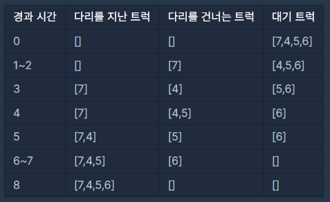 따라서, 모든 트럭이 다리를 지나려면 최소 8초가 걸립니다.