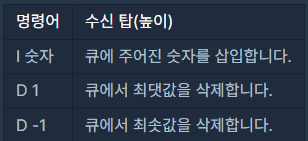 원소는 “명령어 데이터” 형식으로 주어집니다.- 최댓값/최솟값을 삭제하는 연산에서 최댓값/최솟값이 둘 이상인 경우, 하나만 삭제합니다.