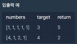사용할 수 있는 숫자가 담긴 배열 numbers, 타겟 넘버 target이 매개변수로 주어질 때 숫자를 적절히 더하고 빼서 타겟 넘버를 만드는 방법의 수를 return 하도록 solution 함수를 작성해주세요.
