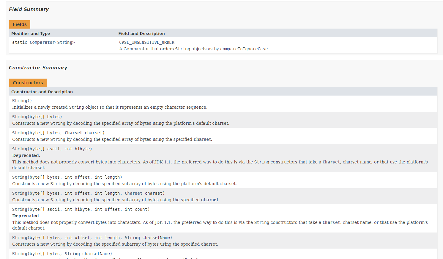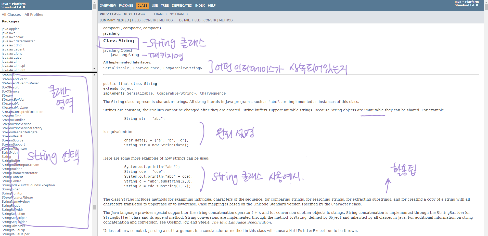 String 클래스를 찾고 있었기에 2번 영역에서 String 클래스를 클릭하면, 위와 같은 페이지가 나온다.
