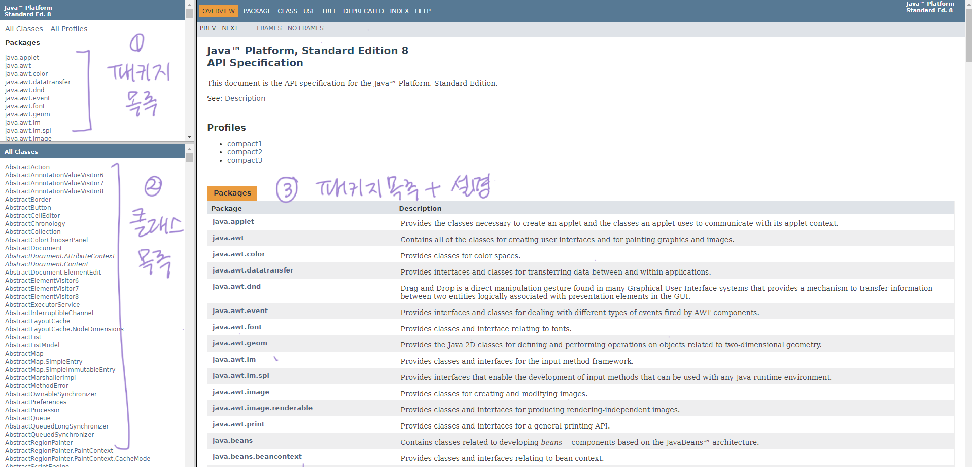 패키지 이름을 알면 1번 영역에서 패키지를 먼저 고른 후, 원하는 클래스를 찾으면 된다.